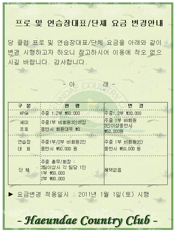 프로 및 연습장대표/단체 요금 변경건