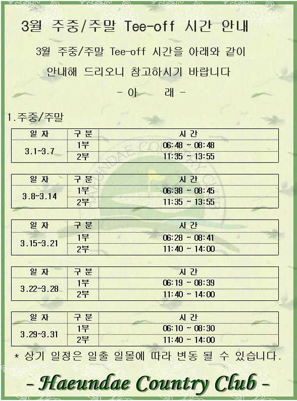 3월 주중/주말 Tee-off 시간 안내.