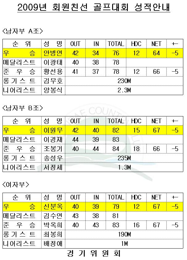 2009년 회원친선 골프대회 성적안내