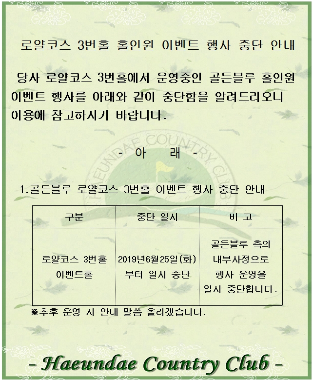 로얄코스 3번홀 홀인원 이벤트 행사 중단 안내