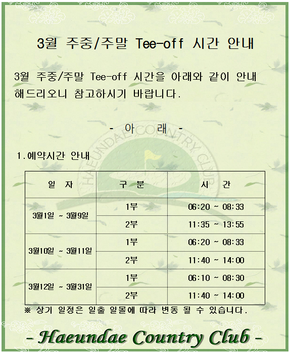 3월 티오프 시간 안내