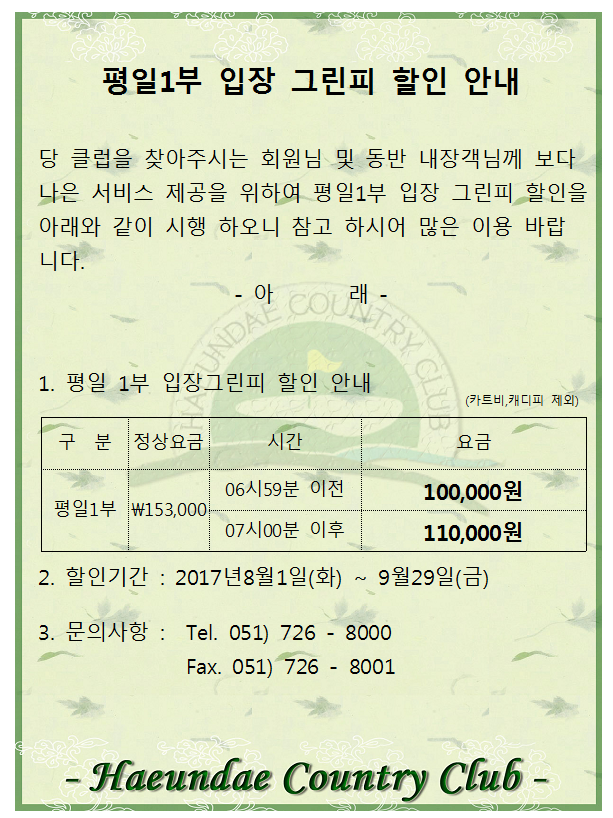 8월~9월 평일1부 입장그린피 안내