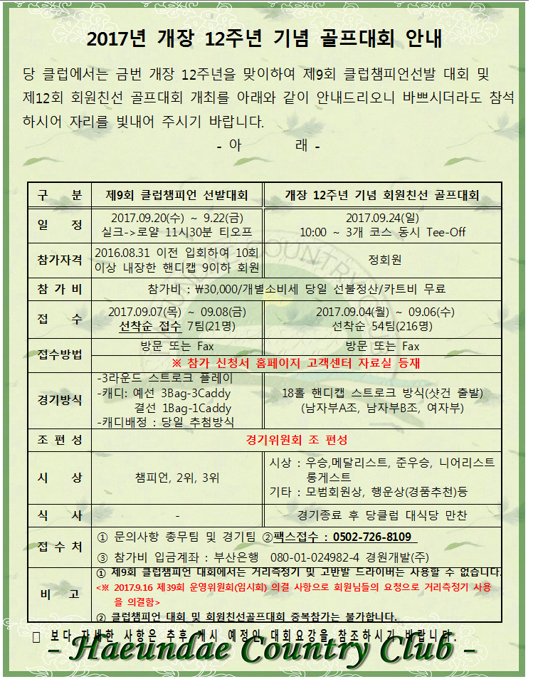 2017년 개장 12주년 기념 골프대회 안내