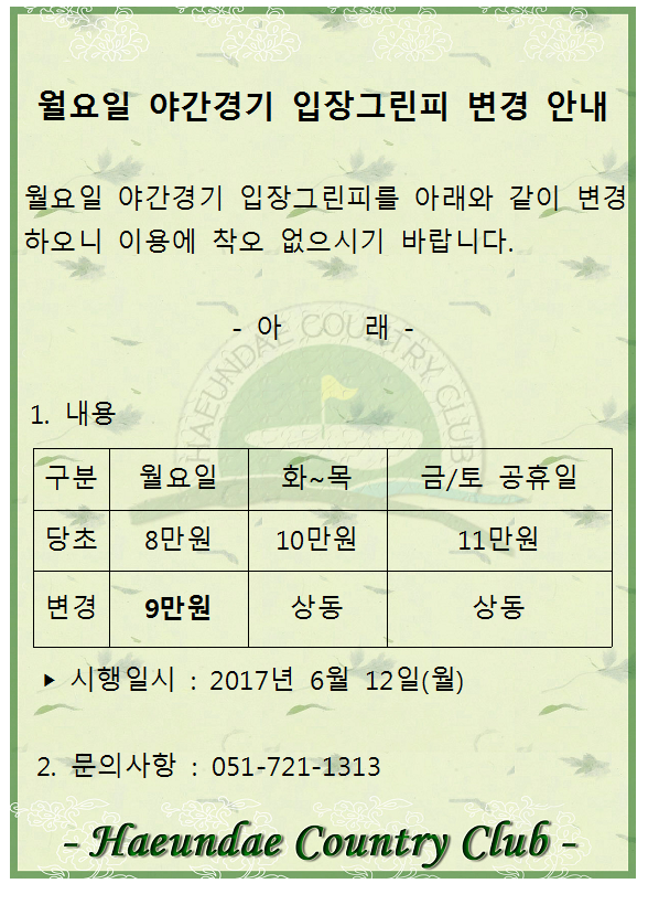 월요일 야간경기 입장그린피 인상 안내