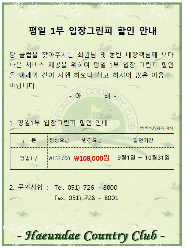 평일 1부 그린피 할인 안내