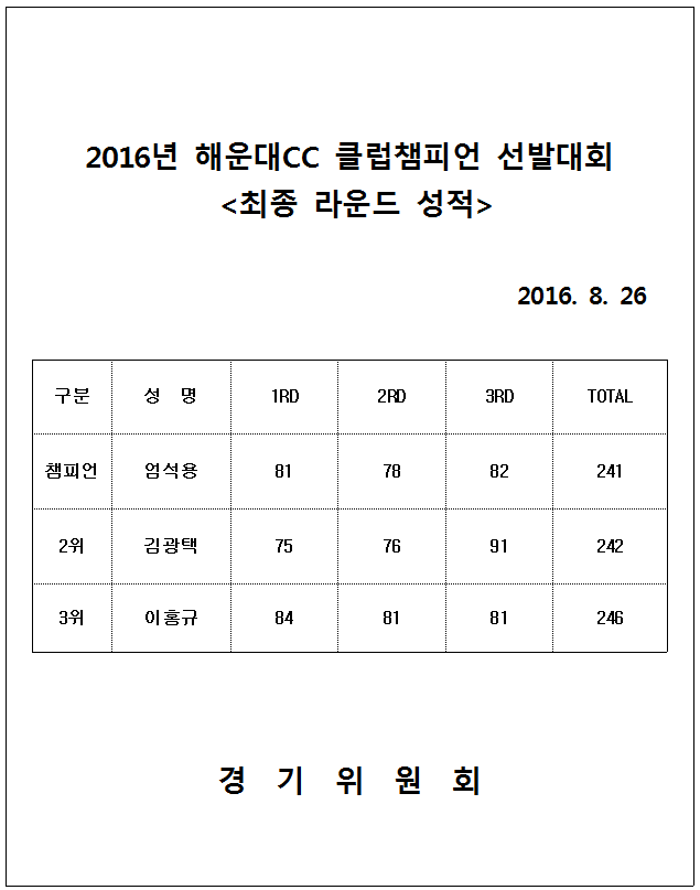 제8회 클럽챔피언 선발대회 최종라운드 성적