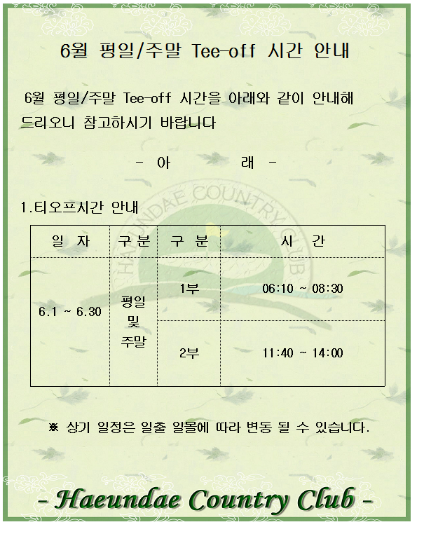 6월 평일 및 주말 공휴일 티오프 시간 안내