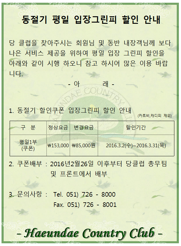 동절기 평일 입장그린피 할인 연장 안내