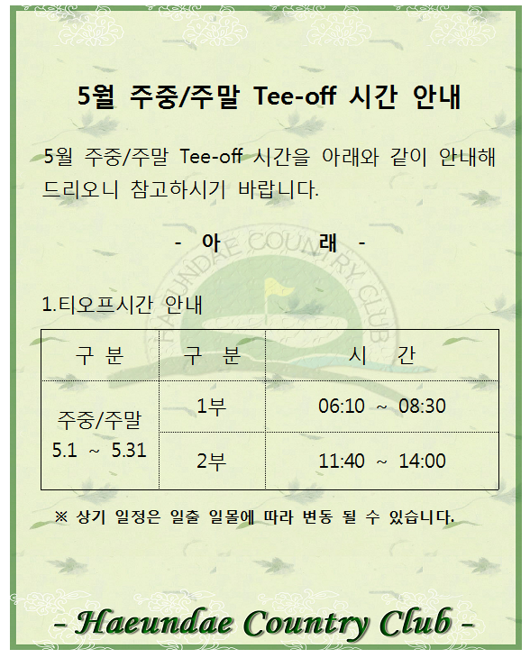 5월 주중/주말 티오프 시간안내