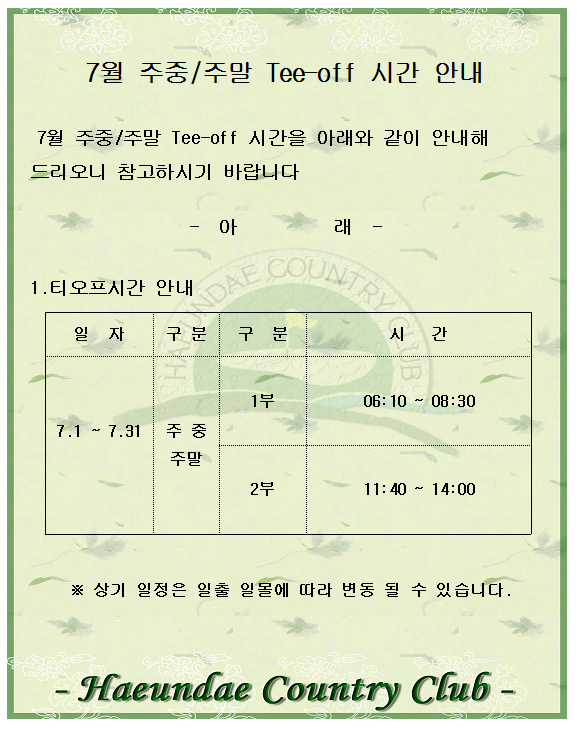 7월 주중/주말 티오프 시간안내