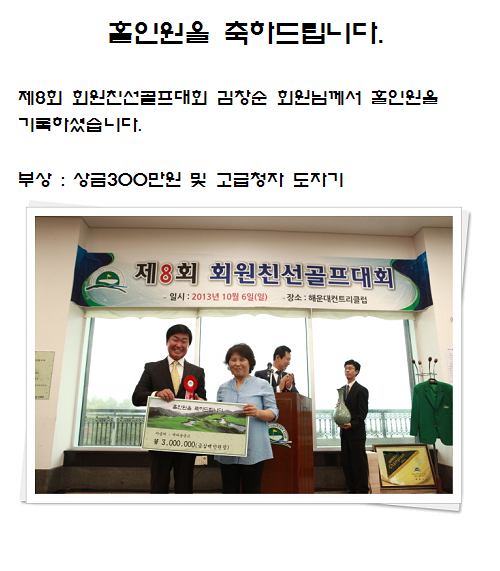친선대회 김창순 회원님 홀인원을 축하드립니다.