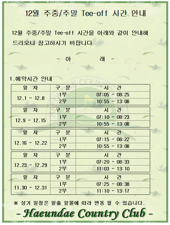 12월 주중/주말 티오프 시간 안내