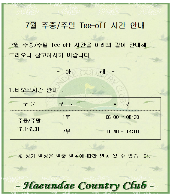 7월 주중주말 티오프 시간안내