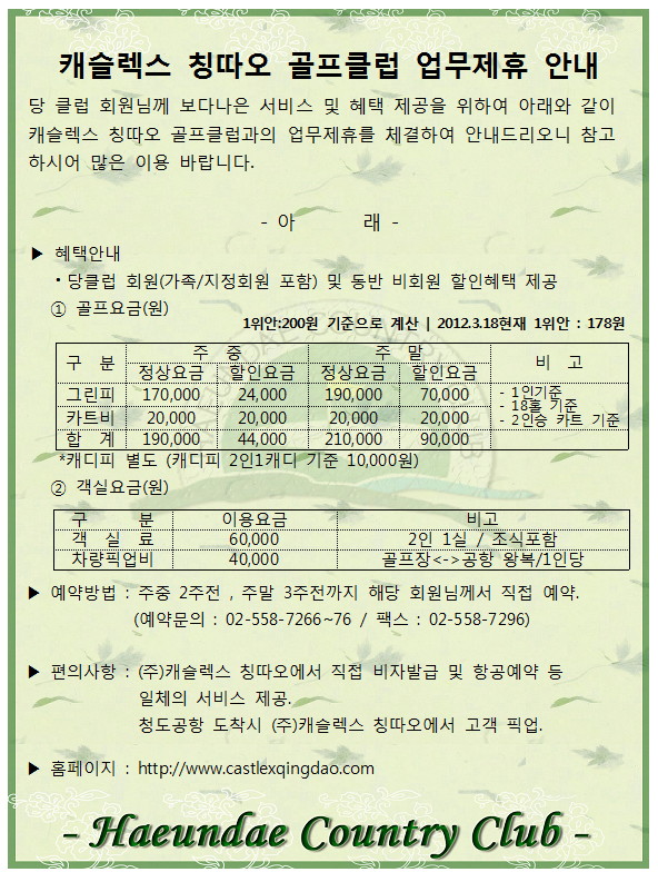 캐슬렉스 칭따오 골프클럽 업무제휴 안내