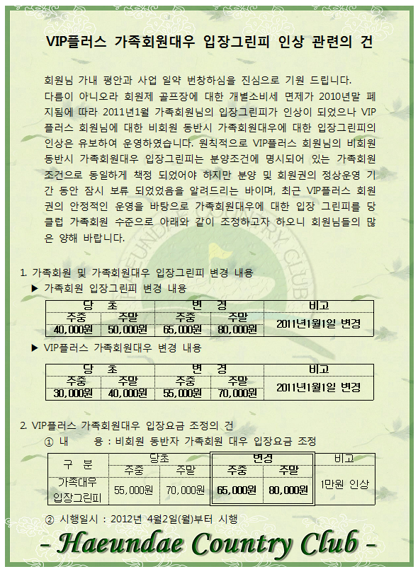 vip플러스 가족회원대우 입장그린피 인상의 건