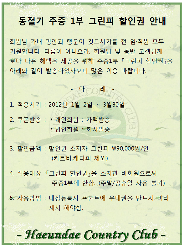 동절기 주중1부 그린피 할인권 안내