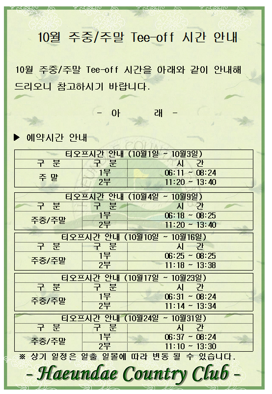 10월 주중/주말 티오프 시간 안내